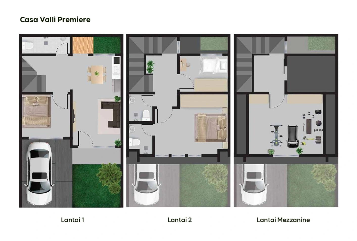 Casa Valli Premiere adalah varian premium dengan ruang lebih luas dan sentuhan desain yang lebih prestisius. Didesain untuk gaya hidup modern, unit ini dilengkapi mezzanine yang memberikan fleksibilitas ruang tambahan, cocok untuk ruang kerja, ruang hobi, atau kebutuhan keluarga lainnya.